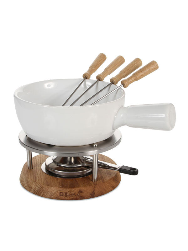 This Boska fondue set makes each meal a feast. With its oak base, integrated burner and white earthenware pot, its luxe appearance belies easy everyday use. The beautifully designed pot can hold up to a gallon of melted cheese--so get your bread ready for dipping!