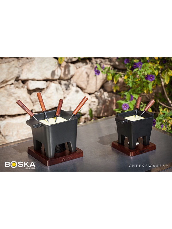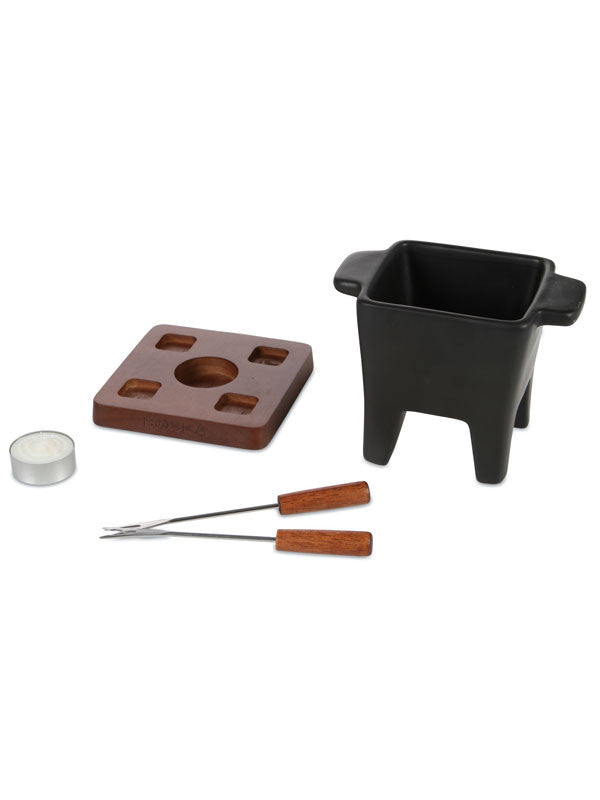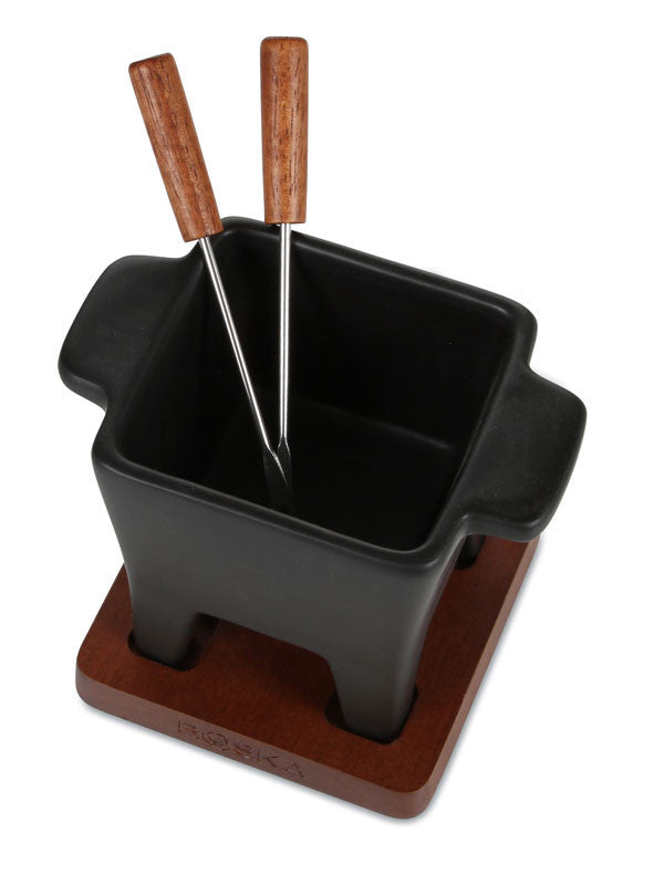 The sleek yet classic Tapas Fondue has a square black ceramic fondue pot with a square base of dark wood. Ideal for serving 2 people, the set comes 2 fondue forks, and 1 cozy tea light to keep the cheese fondue warm. Invite a friend for an evening of delicious tapas! Or, try chocolate fondue for a sweet treat at the end of the meal. The pan has a content of 200 grams/0.2 litres is also microwave safe.