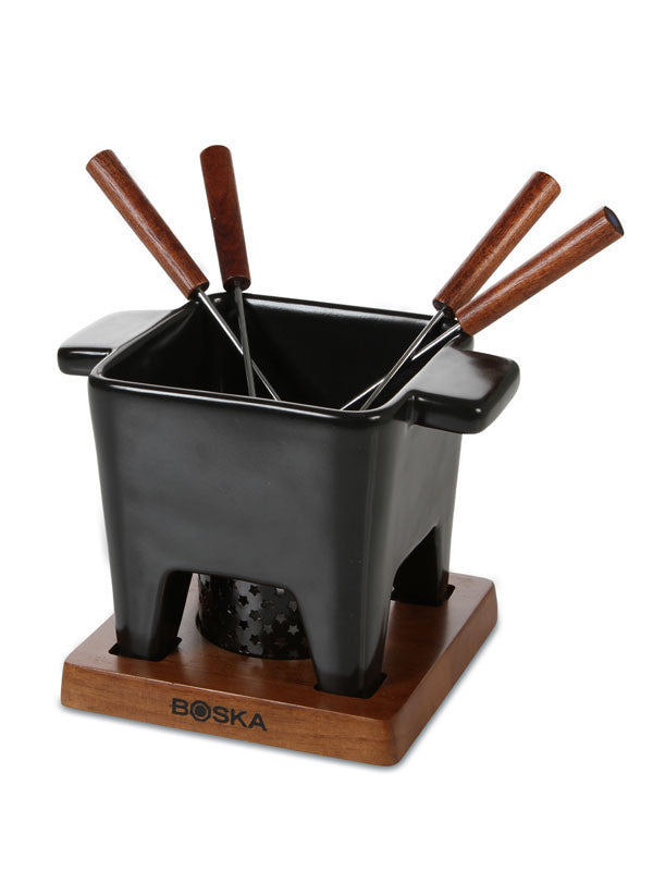 This Tapas Fondue in black has a ceramic fondue pot, solid dark wooden board, 4 forks and 1 tea light to keep the cheese perfectly warm for as long as you need. Keeping the cheese at just the right temperature is critical to making excellent fondue. This pot (400gr.) is ideal for 4 people and microwave safe for convenience and quick warming of the cheese, leaving more time to spend with friends!