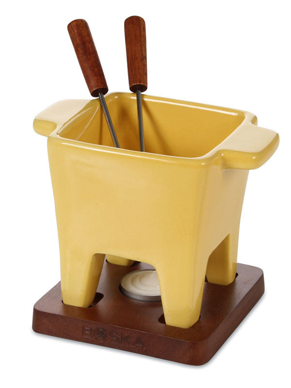 The Tapas Fondue has a square ceramic yellow fondue pot with a square base of dark wood. Ideal for serving 2 people, the set comes 2 fondue forks, and 1 cozy tea light to keep the cheese (or chocolate!) fondue warm. Invite a friend for an evening of tapas! The pan has a content of 200 grams/0.2 litres is also microwave safe.